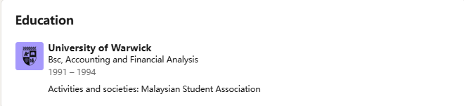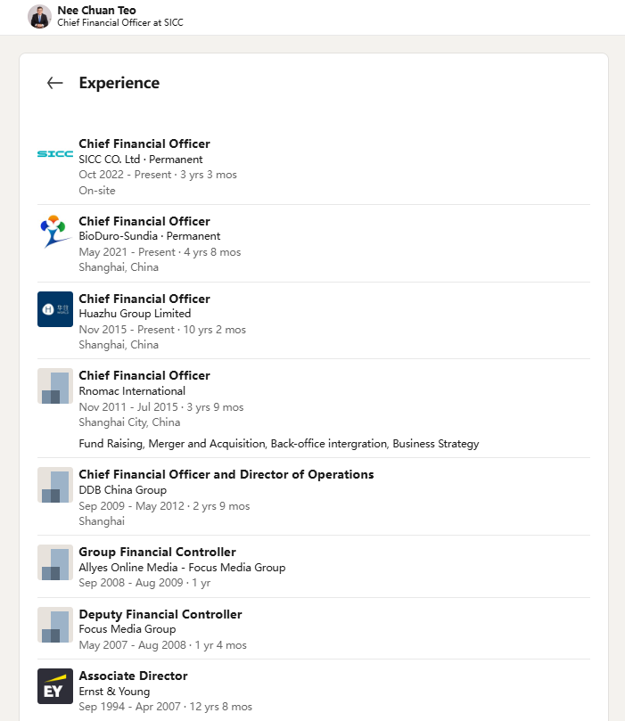于2025年5月加入集团,担任财务高级副总裁(中国新业务开发),并于2025年9月获委任为集团投资及资产管理部主管(中国区)。彼曾担任跨国上市企业之首席财务官,当中涵盖酒店业等不同行业领域。